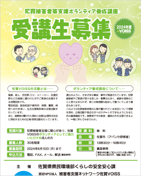犯罪被害者支援に関心があり、佐賀VOISSのボランティアとしてご協力いただける成人の方を募集しています。